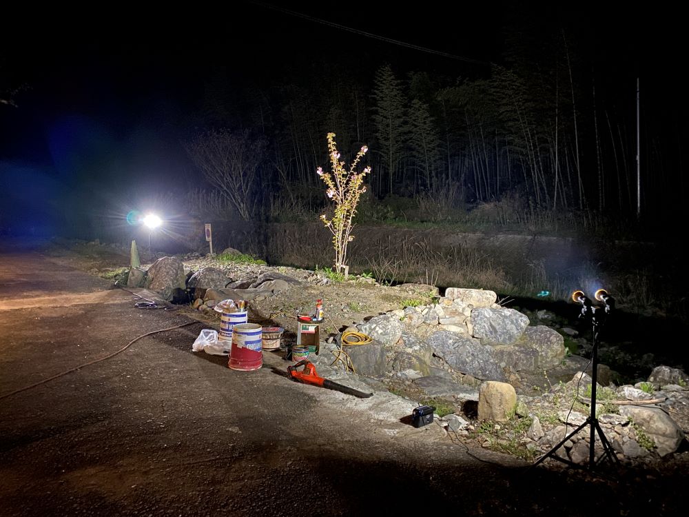 やっと咲いてくれたヤマザクラが嬉し過ぎて1人でライトアップして花見をしたときの写真ですwww
